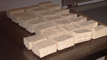 which has been coagulated to form a natural bean curd and can be cut into